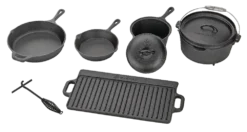 - Woods™ Heritage Cast Iron Camping Cook Set with Crate includes a Dutch oven with lid, pot with lid, 2 skillets 8″ (20.3 cm) and 10″ 25.4 cm), reversible grill 20″ (50.8 cm) x 9″ (22.9 cm) and a pot lifter 4″ (10.2 cm)